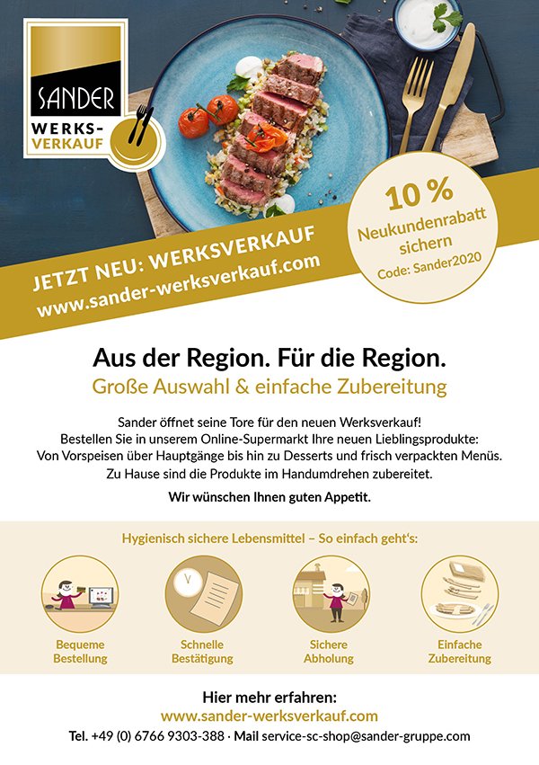 „Solidarisches Denken und Handeln ist heute aktueller denn je. Deswegen haben wir uns dazu entschlossen, die Sander Frische-Manufaktur nun auch für Privatpersonen zu öffnen, um so ein schnelles, praktisches, unkompliziertes und digitales Einkaufen von Lebensmitteln zu ermöglichen. Unsere servierfertigen Frischeprodukte aus eigener Herstellung sind leicht zuzubereiten und eignen sich ideal für den Einsatz im Privathaushalt – für Jung und Alt, vom Single bis zur Großfamilie,“ so Peter Sander, geschäftsführender Gesellschafter der Sander Gruppe in Wiebelsheim im Hunsrück.