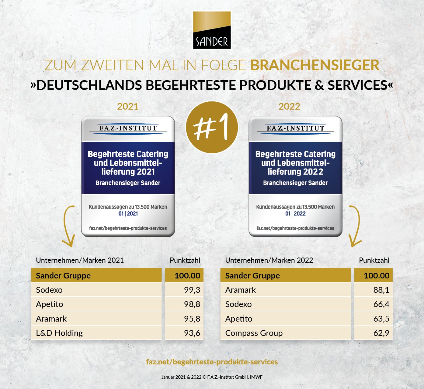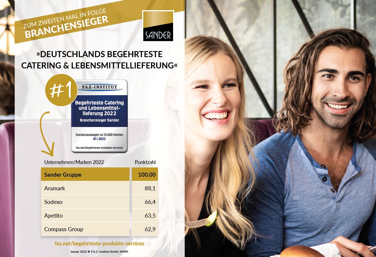 Das F.A.Z.-Institut (aus dem Haus der renommierten Frankfurter Allgemeinen) zeichnet jährlich Deutschlands begehrteste Produkte und Services aus. In der Kategorie Begehrteste Catering und Lebensmittellieferung wurde Sander nach 2021 auch in 2022 erneut zum Branchensieger.