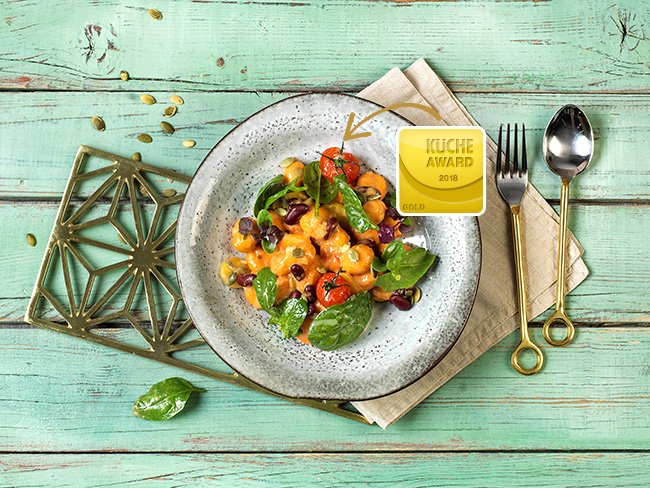 Neuheit „Süßkartoffel-Gnocchi in Erdnusspesto“ mit dem KÜCHE Award GOLD ausgezeichnet
