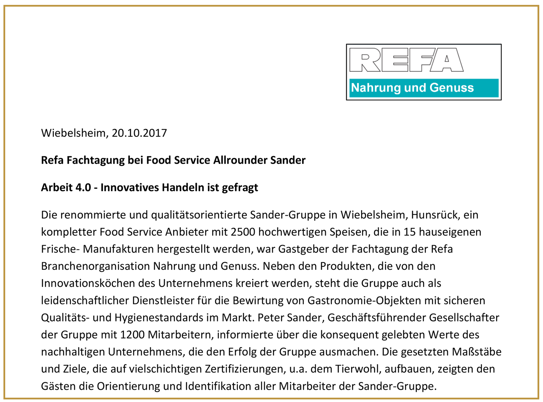 Artikel jetzt lesen:REFA Fachtagung bei Food Service Allrounder Sander (Oktober 2017)