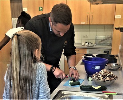Gekocht wurden vier von Sander eigens für das Projekt entwickelte Rezepte mit nicht mehr ganz frischen Lebensmitteln, die dennoch absolut bedenkenlos verzehrt werden können. Am Herd standen nicht die Profiköche, sondern die Schülerinnen und Schüler selbst. Mit viel Spaß wurde eifrig geschält, geschnibbelt, gebrutzelt und gebacken und mit Begeisterung hinterher gemeinsam gegessen. Mit den blitzschnellen Pizzabrötchen mit knackigem Gemüse, der One Pot Pasta, dem Mango Lassi und dem Bananenbrot war für jeden Geschmack etwas dabei!