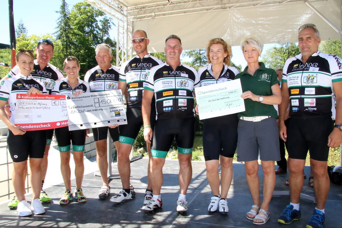 Zum 23. Mal trat wieder eine prominente Besetzung aus Sport, Politik und Gesellschaft vom 5. bis 7. August kräftig in die Pedale, um krebskranke und hilfsbedürftige Kinder zu unterstützen. Die ca. 320 Kilometer lange Benefiz-Radtour mit etwa 3.800 Höhenmetern rollte dieses Jahr durch die Süd- und Westeifel und entlang der Mosel. Auch die Unternehmensgruppe Sander aus Wiebelsheim, die seit fünf Jahren ein fester Bestandteil der „VOR-TOUR der Hoffnung“ ist, war wieder mit von der Partie und überreichte den Organisatoren am zweiten Tag der Tour einen Spendenscheck in Höhe von 15.000 Euro. Insgesamt erbrachte die diesjährige VOR-TOUR eine Rekord-Spendensumme von über 600.000 Euro.